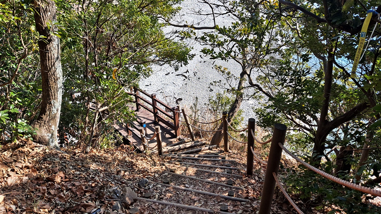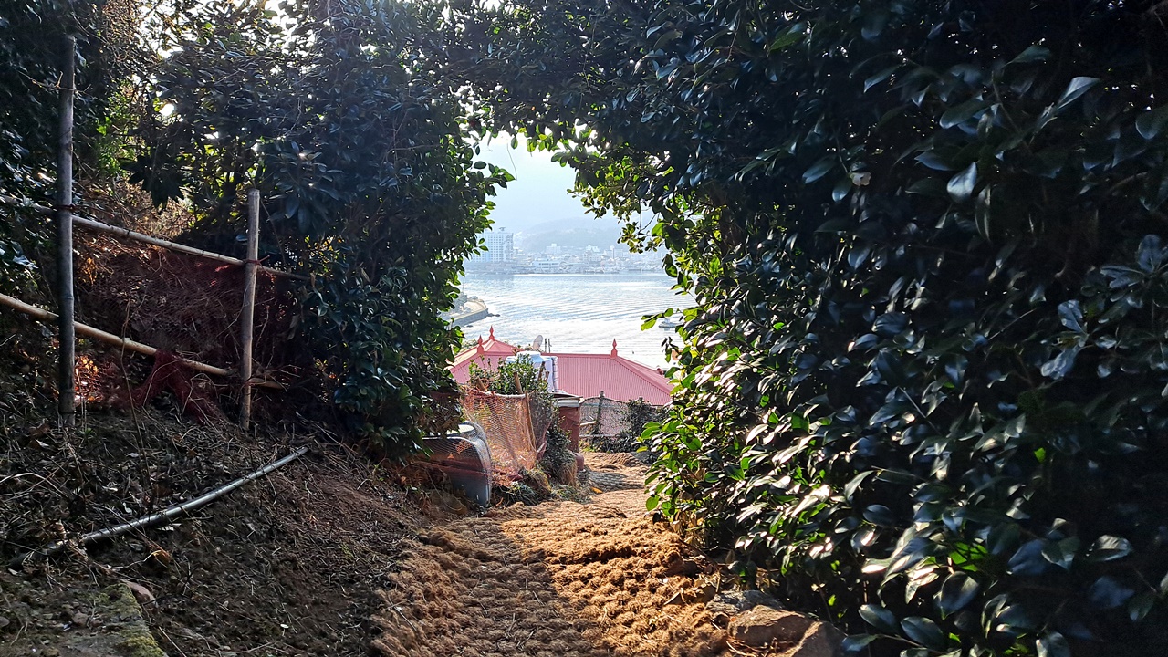 동백나무 터널로 이뤄진 333층 돌계단과 그 위로 흩뿌려진 붉은 꽃잎을 지르밟고 한참을 내려가다 보면