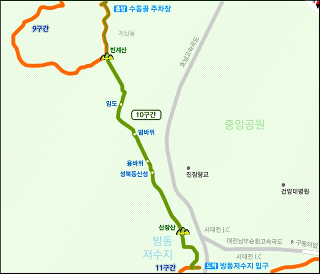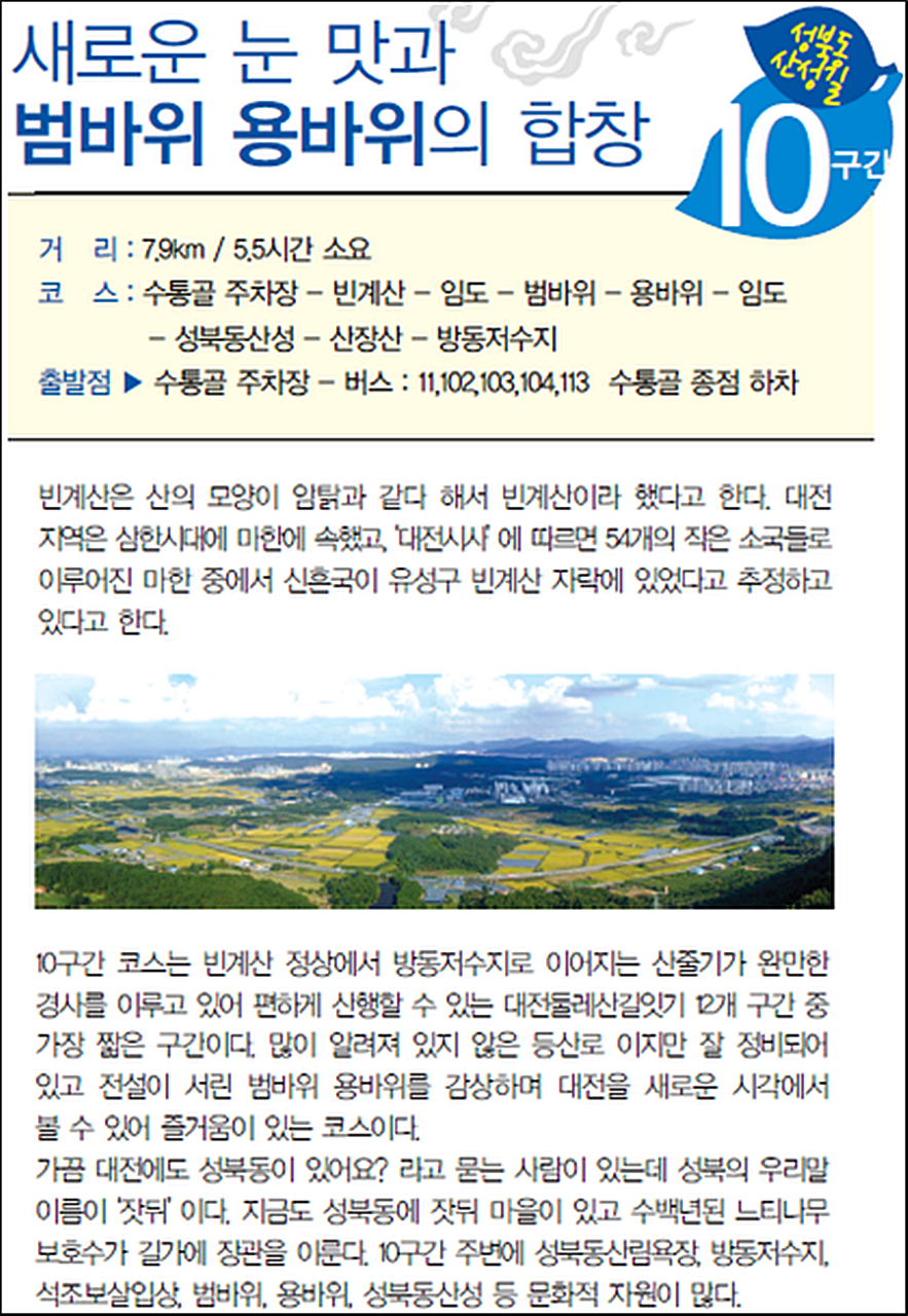 10구간 코스는 빈계산 정상에서 방동저수지로 이어지는 산줄기가 완만한 경사를 이루고 있어 편하게 산행할 수 있는 대전둘레산길잇기 12개 구간 중 가장 짧은 구간이다. 많이 알려져 있지 않은 등산로 이지만 잘 정비되어 있고 전설이 서린 범바위 용바위를 감상하며 대전을 새로운 시각에서 볼 수 있어 즐거움이 있는 코스이다.