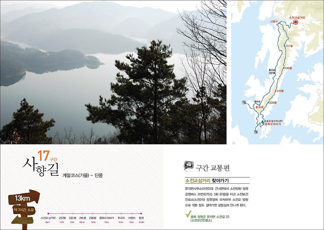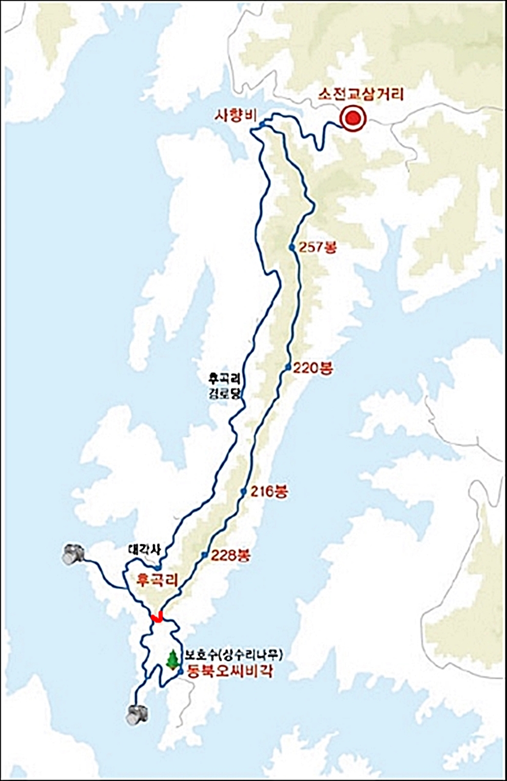소전리 보건소에서 도로를 걸어 내려와 삼거리 왼쪽 소전교를 건너 후곡리를 향하여 걷는다. 폭 좁은 시골 도로가 잘 나있지만 오르막길이다. 약 1.3km 오르면 수몰된 주민들이 고향을 그리워하며 세운 사향비를 만난다. 사향비 앞에서 산행을 시작해 257봉, 220봉, 216봉, 228봉을 걸어 지금은 수몰되어 흔적도 없지만 고인돌 발굴지인 가호리로 나온다. 가호리에서 바라보이는 넓은 대청호를 바라보며 수몰된 마을이 있었음을 알려주는 동복 오씨 비각과 오래된 상수리나무 앞을 걸어 빠져나온다. 흰찔레꽃이 흐드러지게 핀 들길을 걸어 후곡리 버스종점과 대각사를 지나 산등성이를 올라탔던 사향비 앞을 지나 출발지인 소전교에서 마친다. 후곡리 버스종점에서 오른쪽으로 걸어 막다른 마을인 진사골을 둘러보고 와도 좋다.