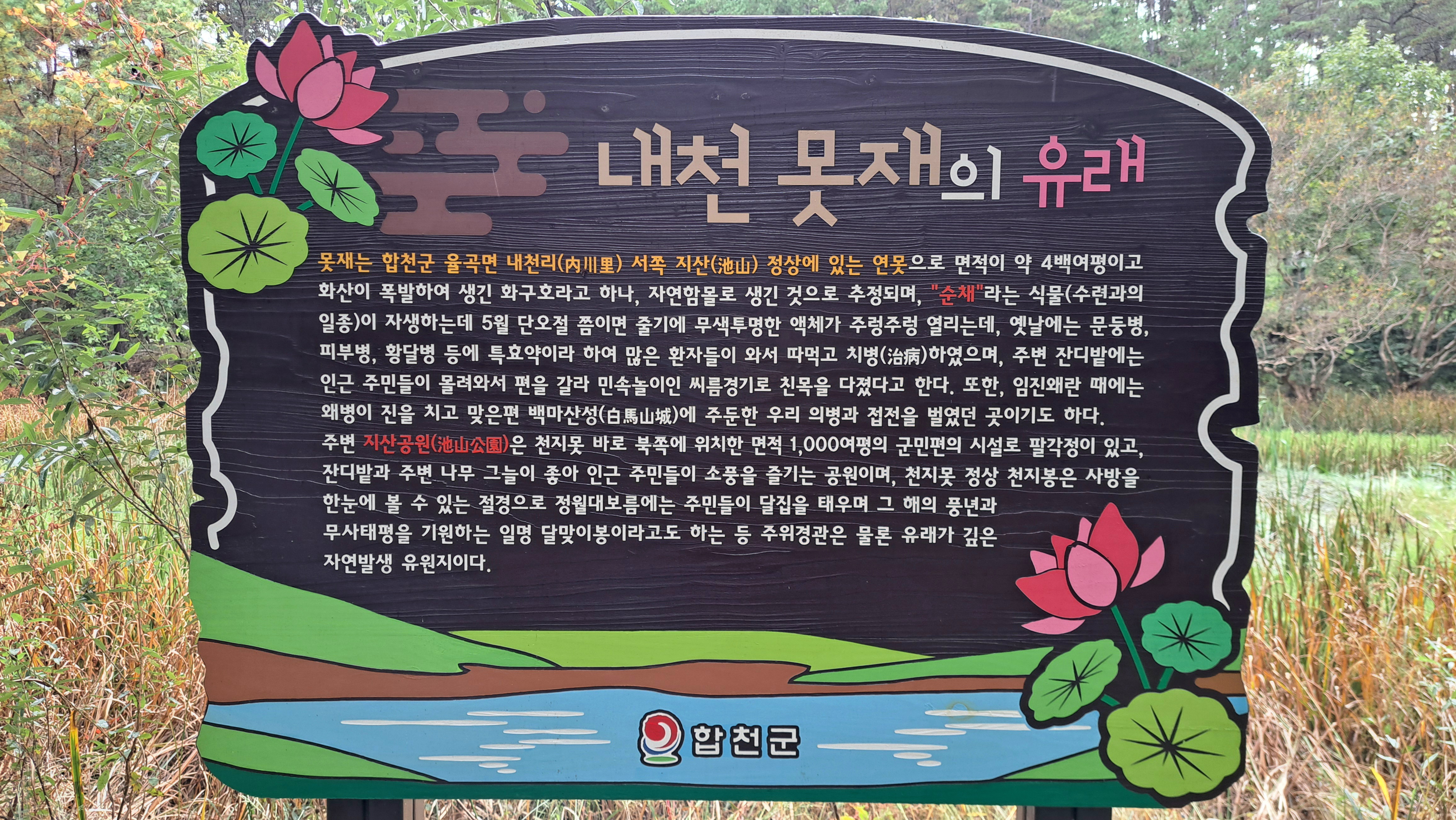 내천 못재는 합천군 율곡면 내천리 서쪽 지산 정상에 있는 연못으로 면적이 약 4백여 평이고 화산이 폭발하여 생긴 화구호라고 하나, 자연 함몰로 생긴 것으로 추정된다. ‘순채’라는 식물이 자생하는데 예전에는 이 식물이 나병, 피부병, 황달병 등에 특효약이라 하여 많은 환자들이 병을 치료할 약재를 구하기 위해 찾아왔으며, 주변 잔디밭에는 인근 주민들이 몰려와서 편을 갈라 민속놀이인 씨름경기로 친목을 다졌다고 한다. 또한 임진왜란 때에는 왜병이 진을 치고 맞은편 백마산성에 주둔한 우리 의병과 접전을 벌였던 곳이기도 하다.