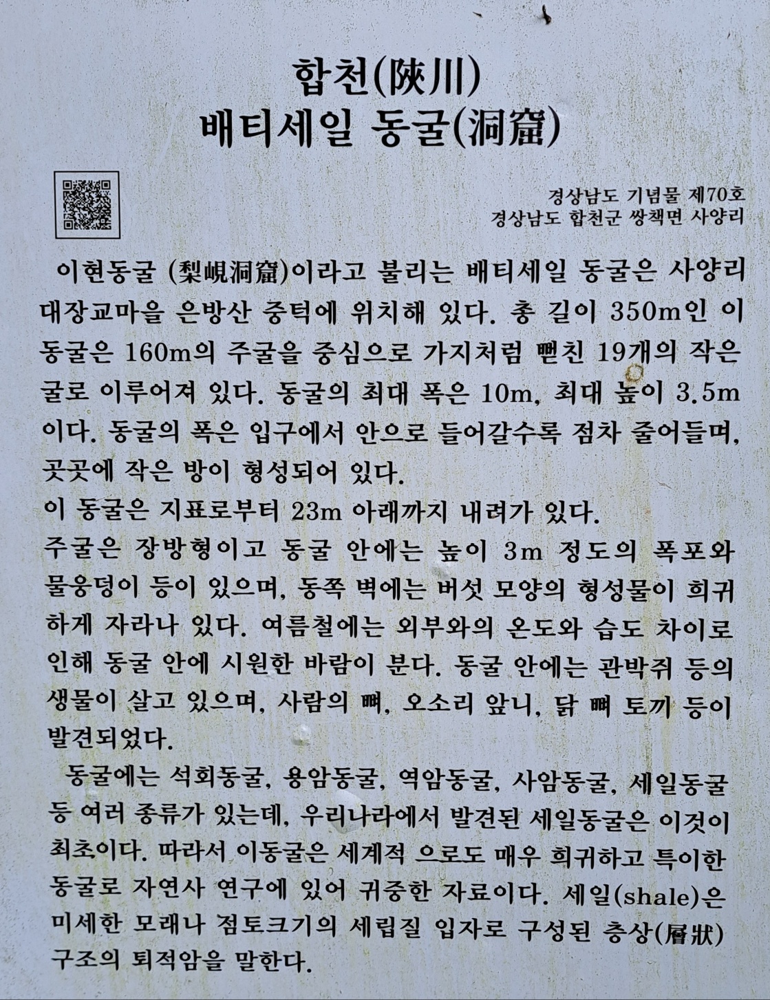 이현동굴이라고 불리는 배티세일 동굴은 사양리 대장교마을 은방산 중턱에 위치해 있다. 총길이 350m인 이 동굴은 160m의 주굴을 중심으로 가지처럼 뻗친 19개의 작은 굴로 이루어져 있다. 동굴의 최대 폭은 10m, 최대 높이 3.5m이다. 동굴의 폭은 입구에서 안으로 들어갈수록 점차 줄어들며 곳곳에 작은 방이 형성되어 있다. 이 동굴은 지표로부터 23m 아래까지 내려가 있다 주굴은 장방형이고 동굴 안에는 높이 3m 정도의 폭포와 물웅덩이 등이 있으며. 동쪽 벽에는 버섯 모양의 형성물이 희귀하게 자라나 있다. 여름철에는 외부와의 온도와 습도 차이로 인해 동굴 안에 시원한 바람이 분다. 동굴 안에는 관박쥐 등의 생물이 살고 있으며, 사람의 뼈, 오소리 앞니, 닭뼈, 토끼 등이 발견되었다.