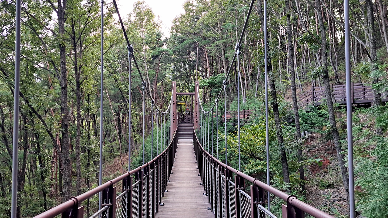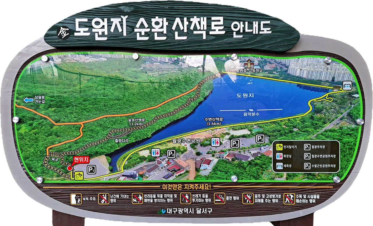 ※ 월광수변공원 주차장-수변산책로-둑방~삼필봉 갈림길~숲 속산책로-출렁다리-공원주차장(안내도 기준 2.8km)