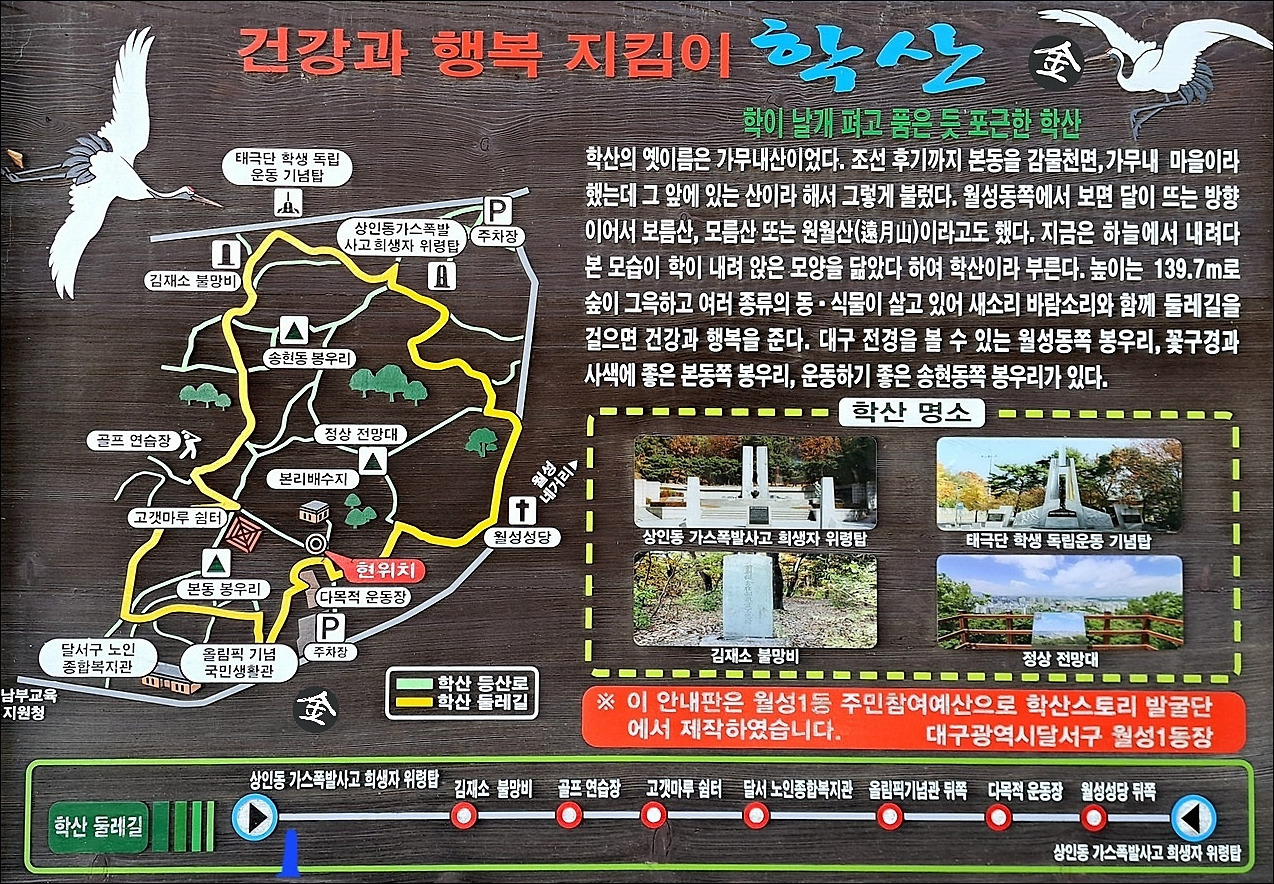 학산의 옛이름은 가무내산이었다. 조선 후기까지 본동을 감물천면, 가무내 마을이라 했는데 그 앞에 있는 산이라 해서 그렇게 불렀다. 월성동쪽에서 보면 달이 뜨는 방향이어서 보름산, 모름산 또는 원월산( 회AlI)이라고도 했다. 지금은 하늘에서 내려다 본 모습이 학이 내려 앉은 모양을 닮았다 하여 학산이라 부른다. 높이는 139.7m로 숲이 그윽하고 여러 종류의 동.식물이 살고 있어 새소리 바람소리와 함께 둘레길을 걸으면 건강과 행복을 준다. 대구 전경을 볼 수 있는 월성동쪽 봉우리, 꽃구경과 사색에 좋은 본동쪽 봉우리, 운동하기 좋은 송현동쪽 봉우리가 있다.