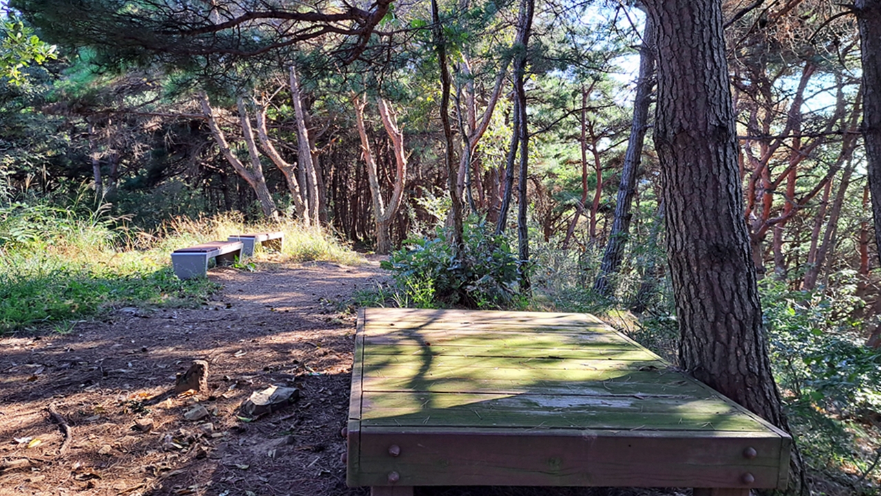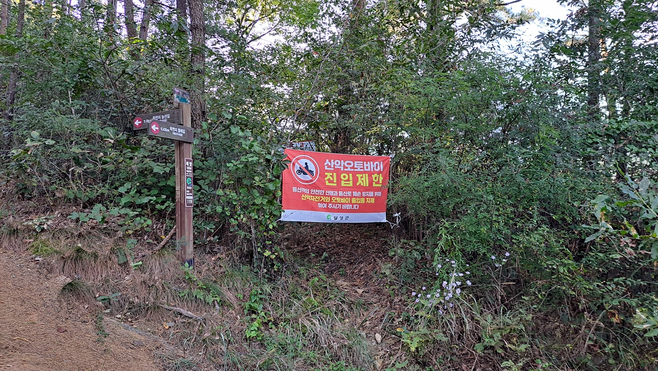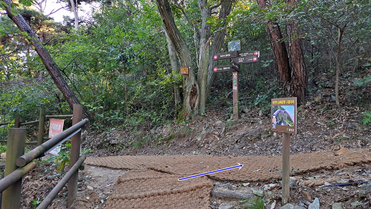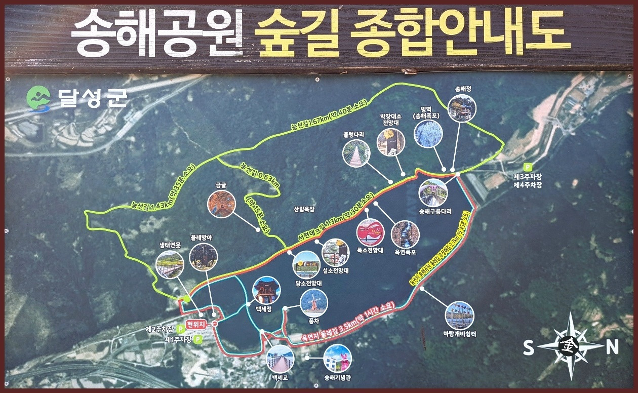 ※ 제1주차장~생태공원~송해기념관~바람개비 쉼터~둑방~구름다리~송해정~능선길(숲길)~옥포읍사무소 갈림길~쉼터~삼각점봉~금굴 갈림길~달성보 녹색길~제1주차장(안내도 기준 5.8km)