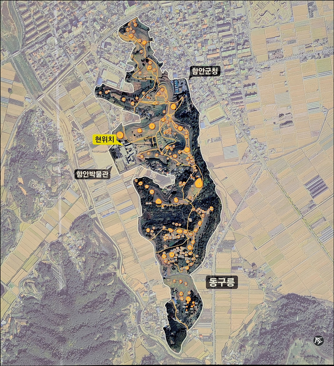 ※ 함안박물관 주차장~야외공연장~말이산 6호분~말이산 4호분~고분군 둘레길~말이산 고분전시관~주차장(안내도 기준 2.6km)