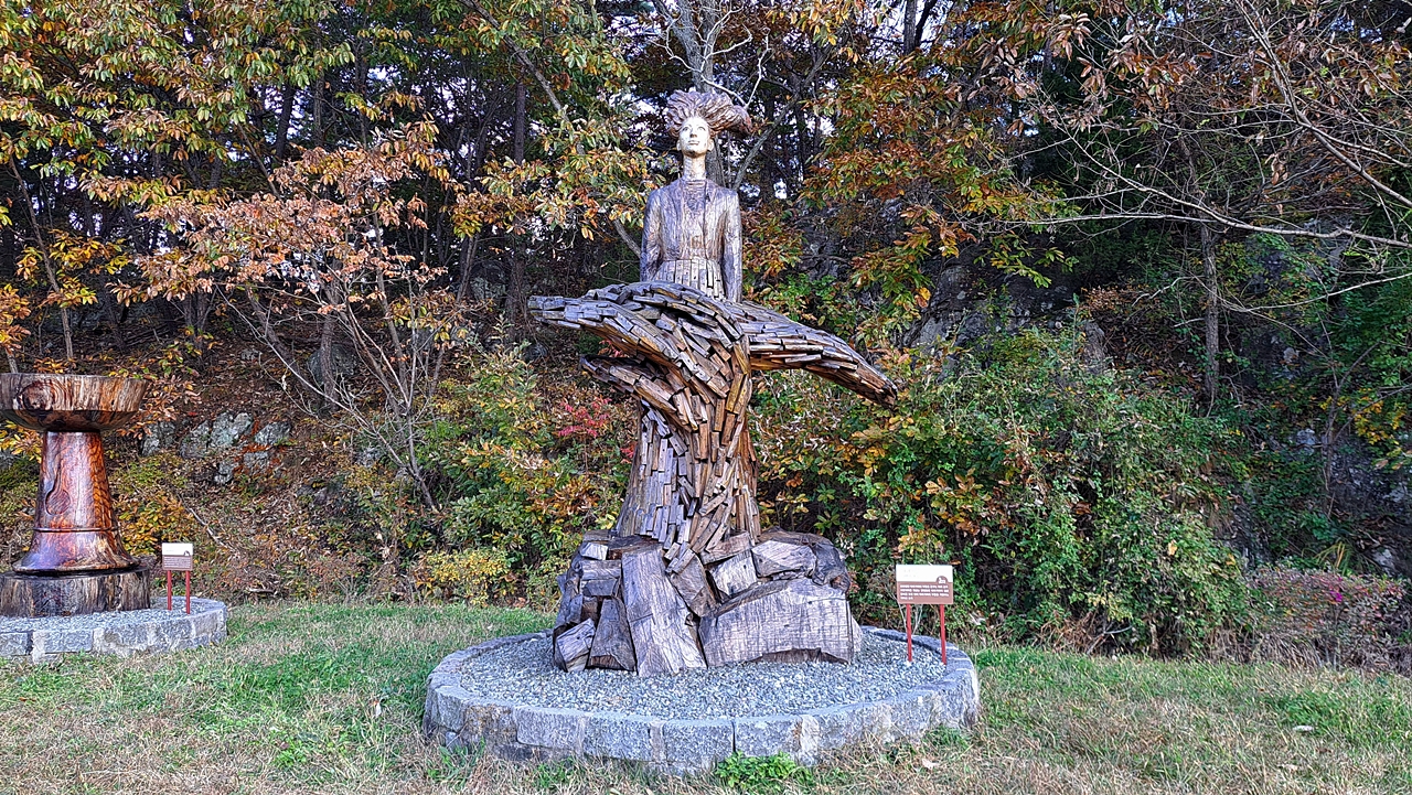 찬란했던 아라가야의 부활을 꿈꾸는 아라 공주 치맛자락을 휘감는 강렬함은 아라가야의 힘찬 웅비를 표현하여 아라가야의 부활을 기원하는 의미로 조각되어 있다