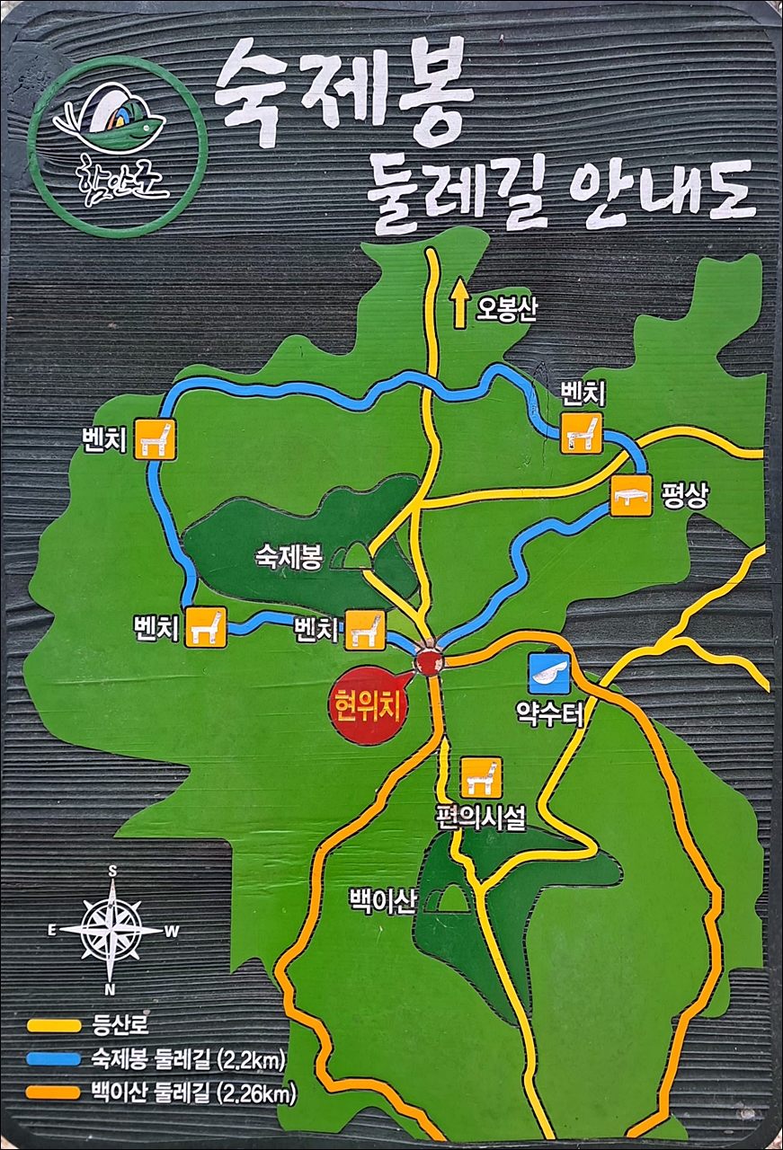 직진해서 올라가면 백이산 정상 가는길, 숲속둘레길은 우측으로 진행하여 숙제봉 둘레길 한바퀴 돌아 다시 이곳으로 돌아 나오는 곳이다. 쉽게 생각해보니 8자형 둘레길이다
