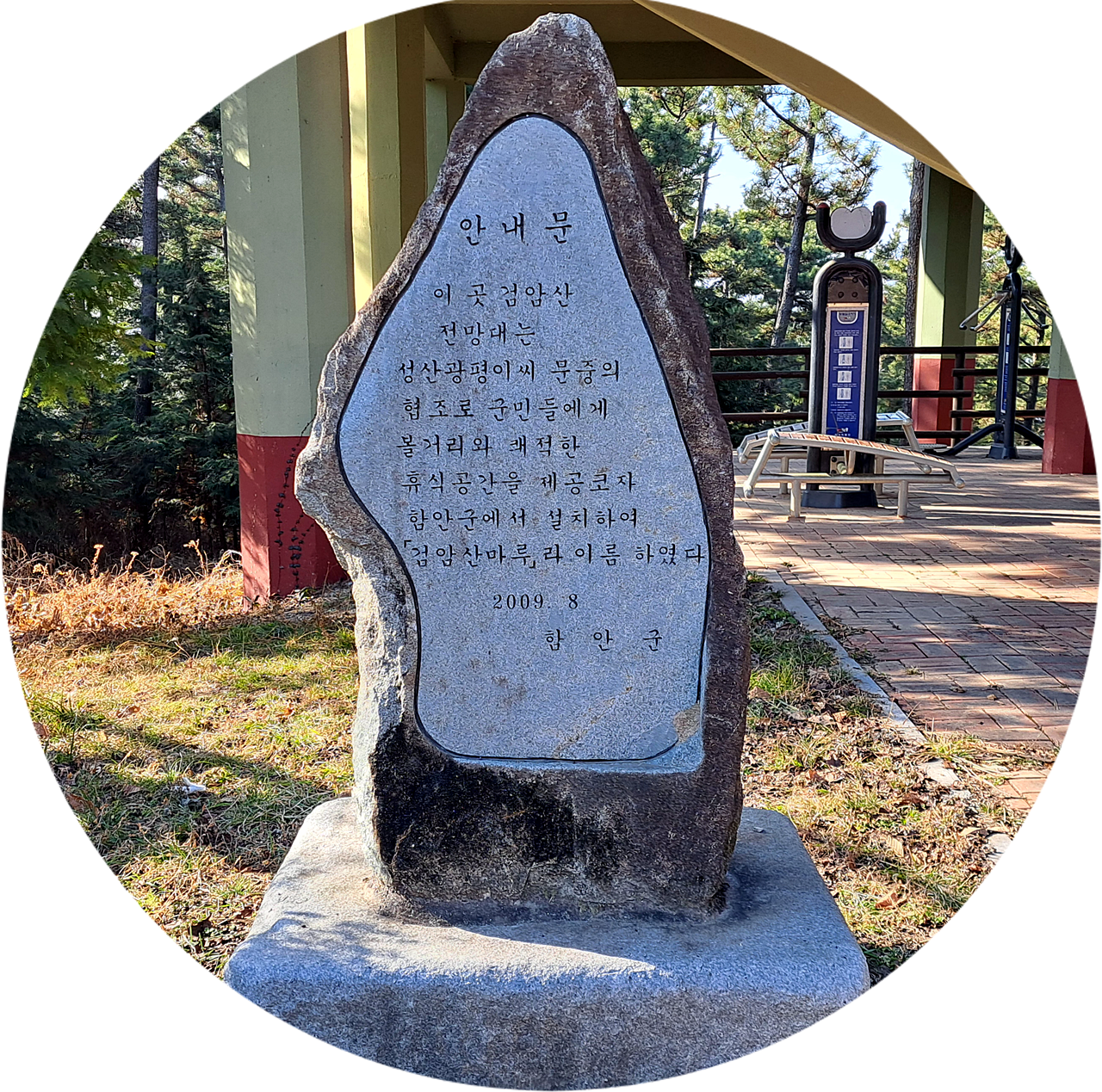 검암산 전망대는 성산광평이씨 문중의 협조로 군민들에게 볼거리와 쾌적한 휴식공간을 제공코자 함. 2009년 8월에 함안군에서 설치하여 "검암산마루"라 이름 하였다고 적혀있다