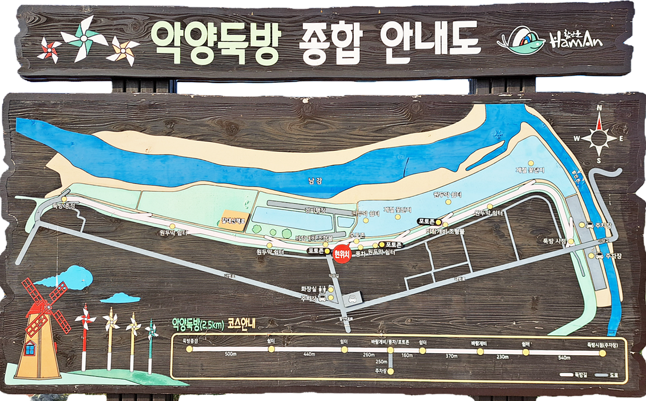 ※ 2008년부터 '10리 둑방 테마 관광 사업'을 시작하여, 악양 제방에 구간별로 야생화를 심고, 주제 공간, 체험장, 편의 시설 등을 설치하여 볼거리를 제공하고 있었지만 지금은 황량한 발판으로 남아있다. ①함안 처녀뱃사공 노을길 2코스 악양둑방길이다